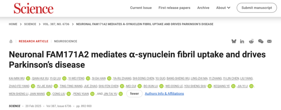 近期,國家神經疾病醫(yī)學中心、腦功能與腦疾病全國重點實驗室、復旦大學附屬華山醫(yī)院郁金泰團隊發(fā)表于《Science》雜志的原創(chuàng)性成果,首次發(fā)現帕金森病全新治療靶點FAM171A2,揭示了FAM171A2作為神經元膜受體在病理性α-syn傳播中的關鍵作用:通過特定內吞途徑介導α-syn纖維內吞的機制,還發(fā)現潛在抑制劑Bemcentinib,為帕金森病的治療提供了重要的理論依據和潛在干預靶點。